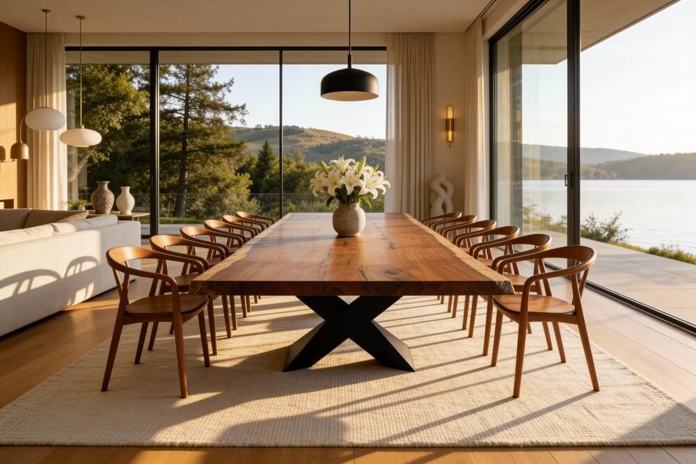 Maggia is a unique dining table made from a single slab of solid parota wood. Its generous size and natural shape make it stand out, while the wide surface offers plenty of space for gatherings, table settings, and decoration. A timeless piece that works beautifully in both elegant homes and refined restaurant spaces.