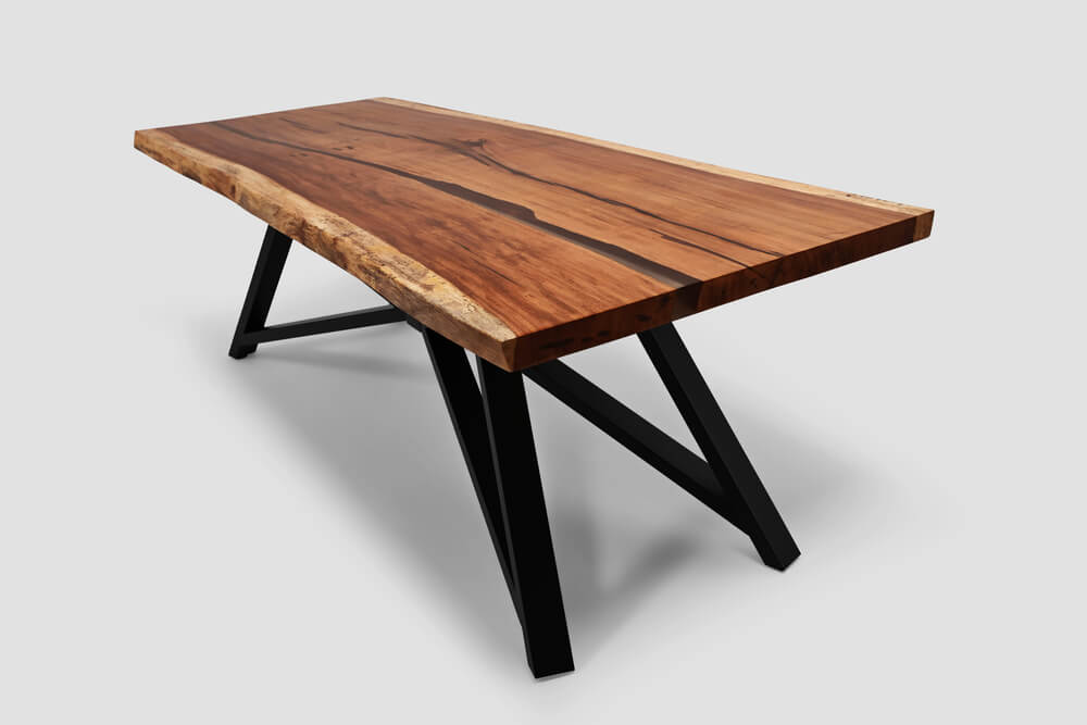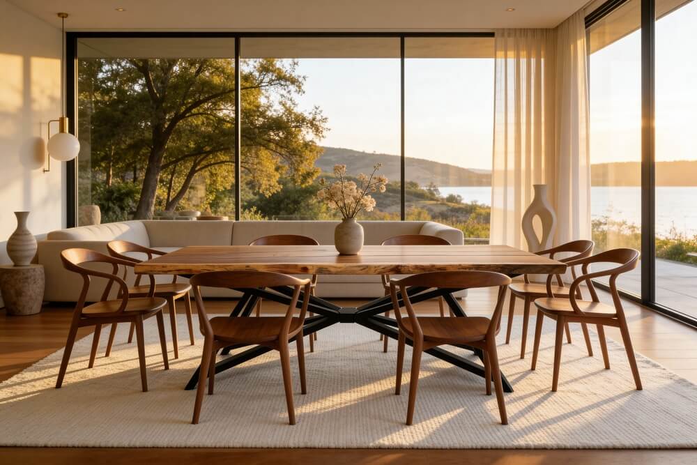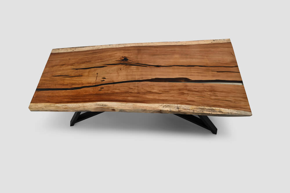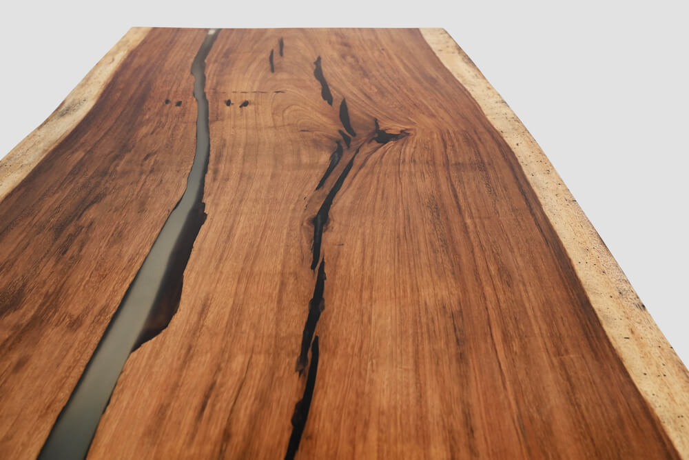 Nicoya is a compact and elegant parota wood table featuring two natural resin borders that highlight its shape. Its generous length and width make it ideal for up to eight people, whether for dining or hosting.