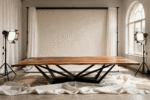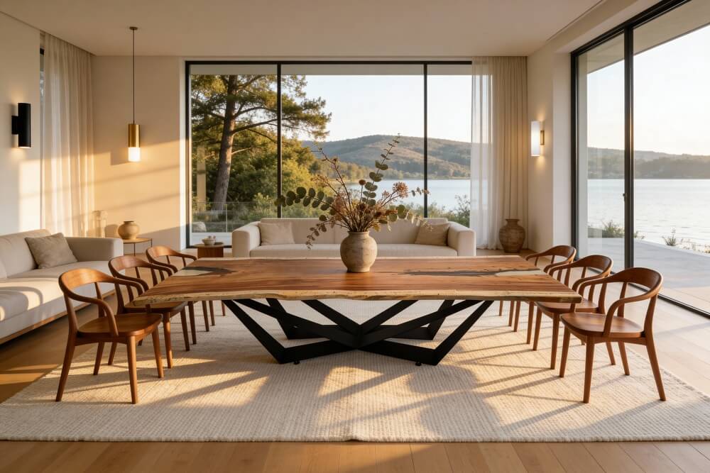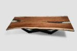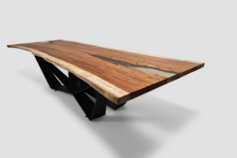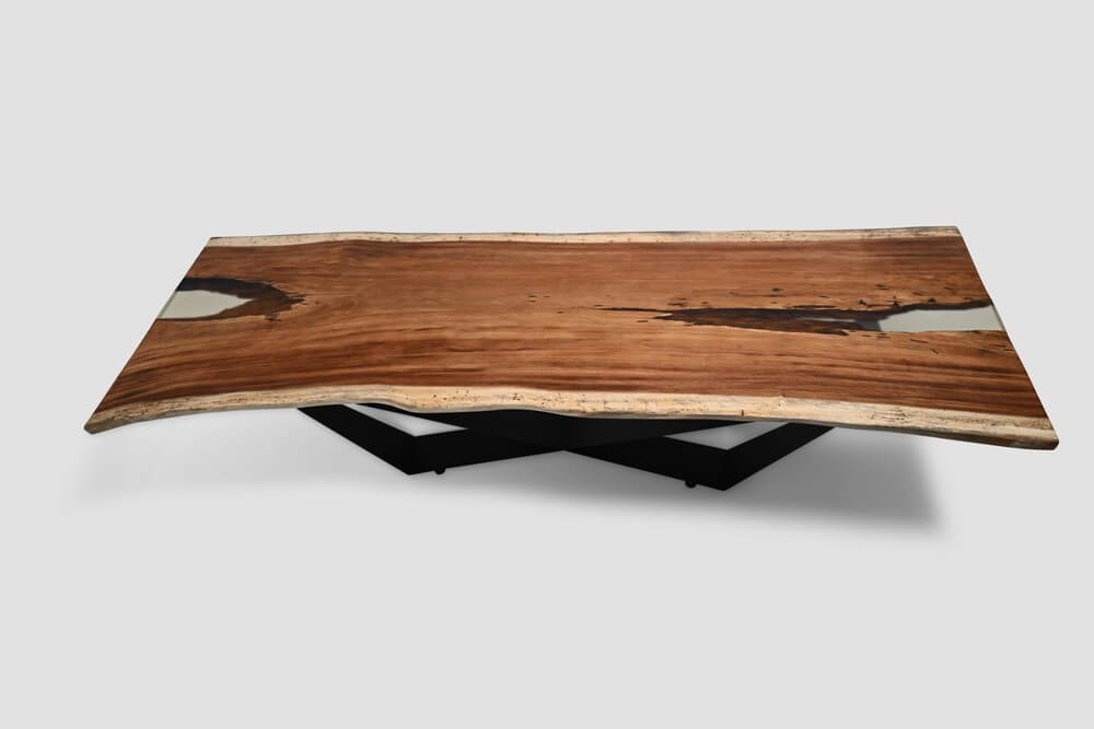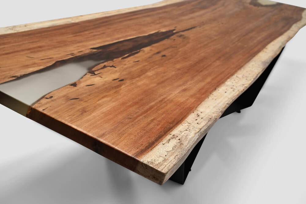 Riviera is a wide parota wood table with transparent resin on both sides. Its generous width offers plenty of space for dining, working, or decorating. The clear resin edges create a light, modern look while highlighting the organic shape of the wood.
